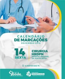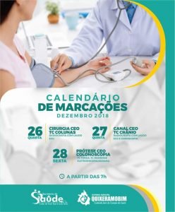 A Secretaria de Saúde de Quixeramobim divulga para seus usuários o calendário das datas para agendamentos de exames e consultas do período de Dezembro 2018 e Janeiro 2019, com o objetivo de manter uma comunicação mais próxima ao cidadão.