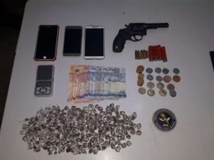 Durante um policiamento ostensivo no bairro Araturi, os raianos avistaram um indivíduo em atitude suspeita na Rua A. Ao avistar a composição, o homem entrou rapidamente em uma residência e conseguiu fugir pelo quintal. No imóvel após buscas, os militares encontraram um revólver cal. 38, nove munições intactas, 300 trouxinhas de maconha, uma balança de precisão, três aparelhos celulares, 11 pássaros da fauna brasileira e um valor em dinheiro de R$ 268,35.
