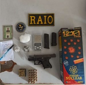 Os raianos foram ao quintal da casa e lá encontraram uma bolsa contendo uma pistola calibre 380, quantidades de cocaína, maconha e crack, além disso uma balança de precisão, dois carregadores de pistola, 37 munições de calibre 380, cinco munições calibre 38 e uma de calibre .40. Foi dada voz de prisão ao suspeito, e ele foi levado para a Delegacia Metropolitana de Caucaia, onde foi autuado em flagrante por porte ilegal de arma de fogo e tráfico de drogas.