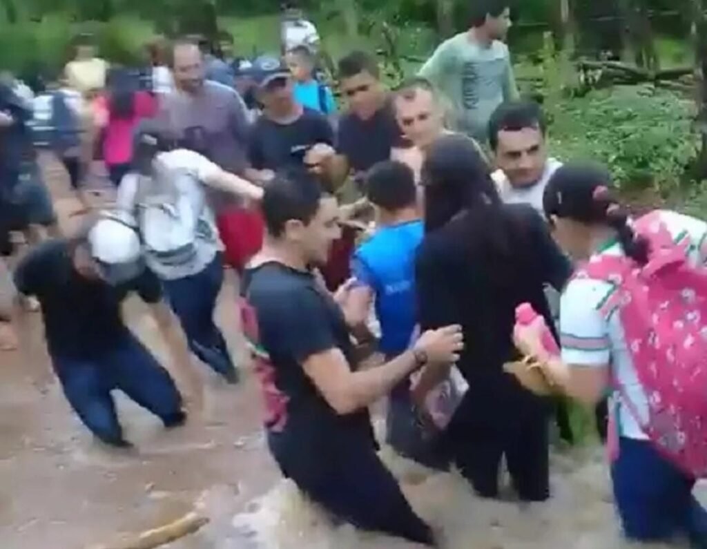 Os alunos aparecem com mochila nas costas, fardados e sendo ajudados por homens em uma região de mata. Eles seguram em corda para não caírem ou serem arrastados pela forte correnteza. O caso aconteceu na semana passada.