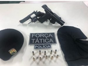 Em diligência até um residencial da região, os policiais militares se depararam com dois suspeitos, que tentaram se evadir ao perceberem a chegada da Polícia. Houve uma perseguição, até que os militares apreenderam um adolescente de 16 anos, sem passagens pela Polícia, que estava com um revólver calibre 38, cinco munições e uma balaclava. O segundo indivíduo, que também foi contido pelas equipes policiais, trata-se de Moabe da Silva Xavier (20) – com passagem por porte ilegal de arma de fogo. Ele estava com uma pistola calibre .40.