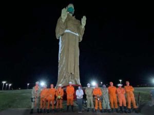 Bombeiros de Canindé colocam máscara facial na estátua de São Francisco