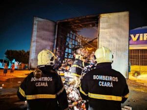 A guarnição de serviço na 1ª Companhia do 3º Batalhão de Bombeiros Militares (1ª Cia/3ºBBM), em Sobral, foi acionada pela Coordenadoria Integrada de Operações de Segurança (Ciops) da Secretaria da Segurança Pública e Defesa Social (SSPDS), para atender uma ocorrência de incêndio em caminhão tipo baú. O fato se deu por volta das 22h50min, desta quarta-feira (21), no pátio de uma empresa vulcanizadora de pneu, próximo ao quilômetro 222 da rodovia federal BR 222, no município de Sobral.