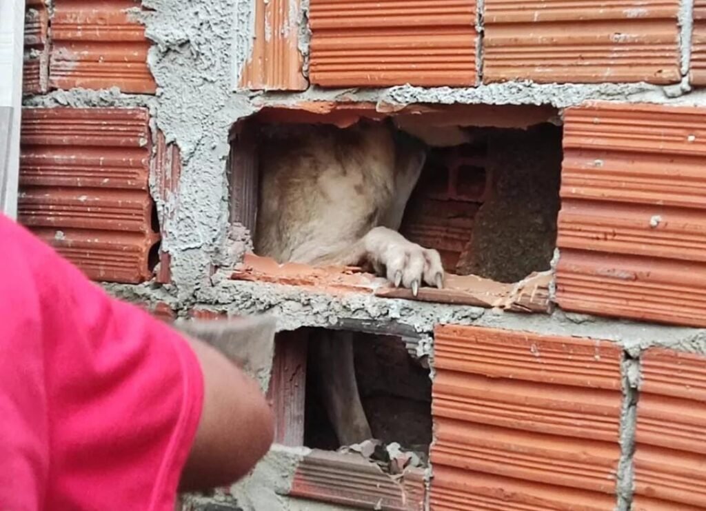Para o resgate, os bombeiros tiveram que subir no telhado de uma das casas para visualizar o local onde o animal estava preso. Logo em seguida, foi feita a medição para o acesso, parte da parede foi quebrada com uma marreta, e o cachorro foi resgatado sem ferimentos.