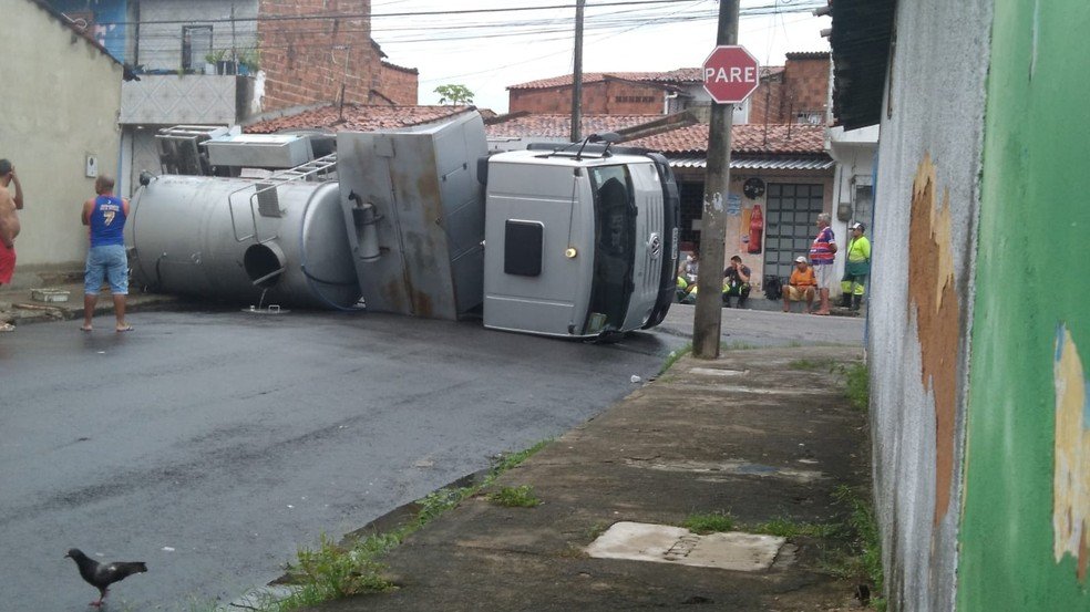 Vídeos registrados por moradores do bairro mostram o caminhão tombado e vários curiosos no local. As imagens também mostram um guindaste tentando virar o veículo.