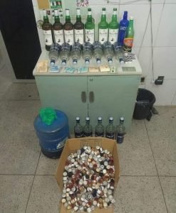Os militares entraram na casa, onde encontraram Francilania Elnilse Silva Santos (44) e Welisson Felipe Beserra da Silva (31). Foi realizada revista no imóvel e em um dos compartimentos os agentes de segurança encontraram várias garrafas de vodka, uísque e também de água mineral, algumas ainda com o produto; vasilhames contendo corante; uma caixa com tampas de uísque; e R$ 4.834,40 em espécie.