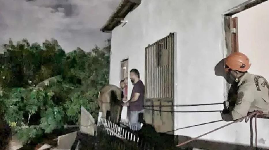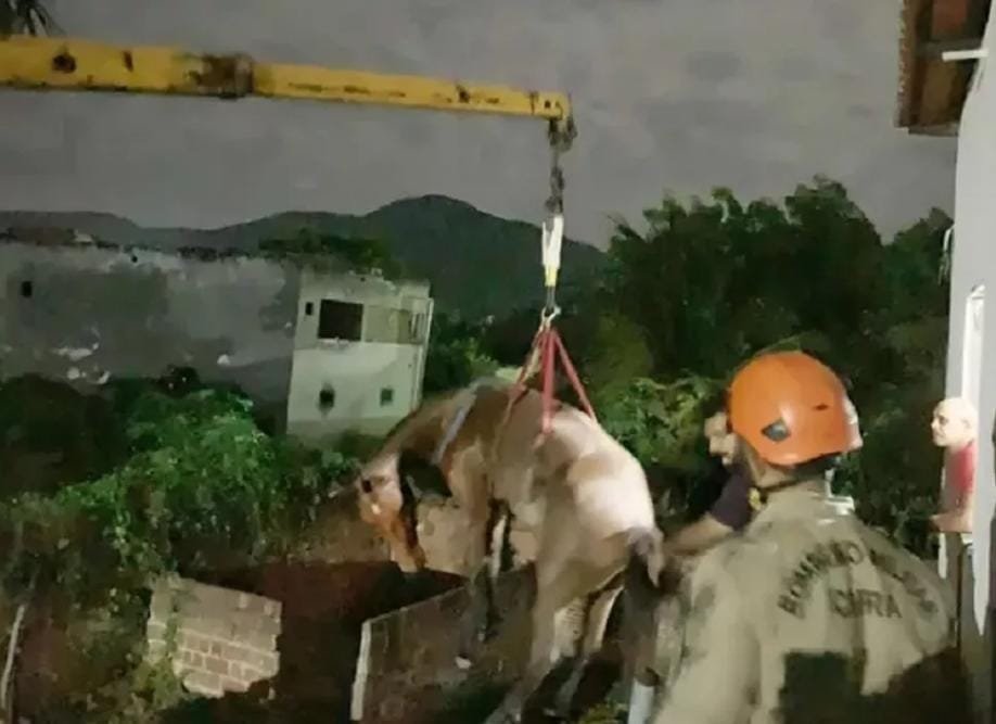 Um cavalo foi parar sobre a laje de uma residência de três metros de altura e foi resgatado pelo Corpo de Bombeiros município de Itapipoca, a 130 km de Fortaleza. O animal foi retirado do local sem ferimentos.