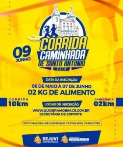 A Prefeitura Municipal de Quixeramobim, através da Secretaria de Esporte, Juventude e Integração, convidam para participar de mais uma edição da tradicional Corrida e Caminhada de Santo Antônio.
