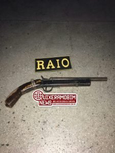 Na noite desta terça-feira dia 09/07/2019, por volta das 21h30min, a equipe do RAIO realizava patrulhamento de rotina na Av. Geraldo Bizarria, Quixeramobim-Ce, quando avistou 02 indivíduos em uma motocicleta CG Titan KS 150c , de cor prata, em atitude suspeita. Ao realizar a abordagem, os acusados foram identificados como A. W. B. S. e um adolescente. Foi encontrada uma arma garrucha do tipo socadeira. Diante do fato, os elementos foram conduzidos até a Delegacia Regional de Polícia Civil de Quixadá-CE, onde foram apresentados a Autoridade Policial juntamente com a arma apreendida, para adoção das medidas cabíveis.