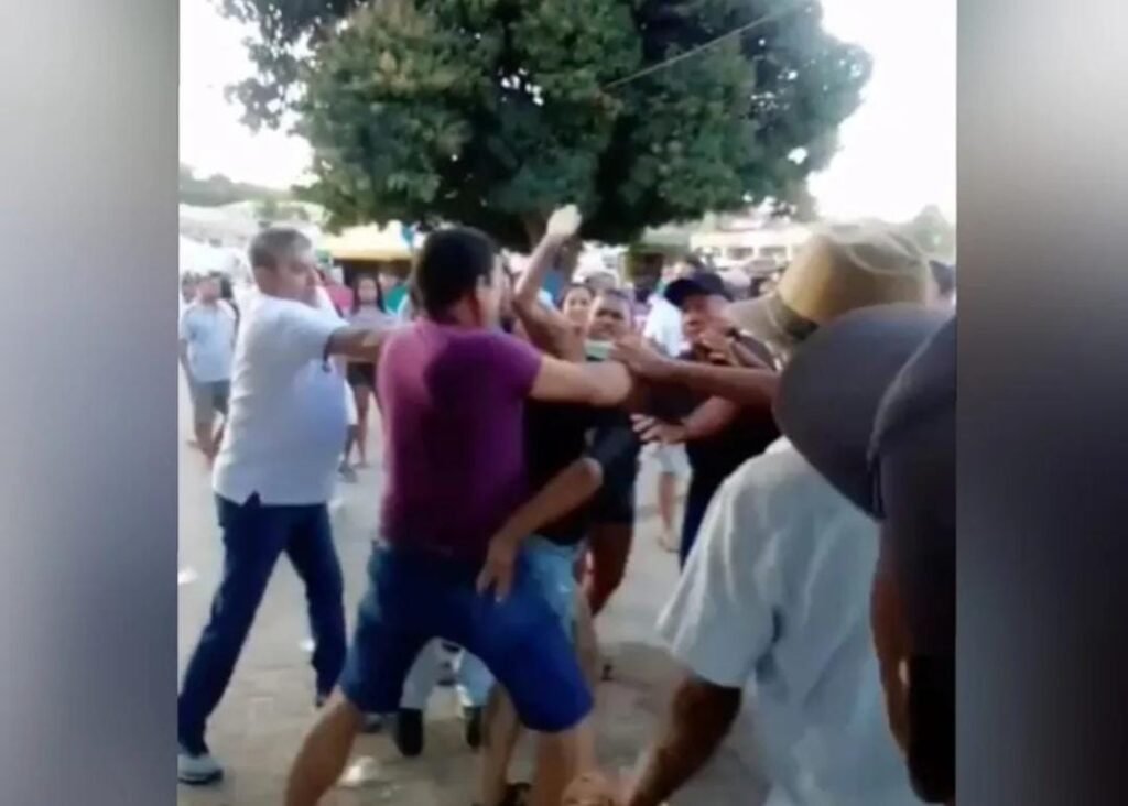 Vídeos enviados ao g1 mostram várias pessoas se agredindo. Um homem aparece com o rosto todo ensanguentado e várias pessoas brigando entre si. Eles arremessam objetos e uma mulher chega a levar uma cadeirada na cabeça.