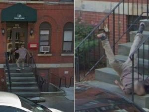 Imagine a cena: você está explorando virtualmente uma nova vizinhança, através do Google Street View, quando, de repente, é surpreendido com a imagem de um estranho caindo de uma escada na entrada de um prédio. Este flagra inusitado foi feito por usuários da plataforma ao buscarem por uma rua da cidade de Hoboken, no estado de Nova Jersey (EUA). A queda, disponível no giro de 360 graus, viralizou nas redes sociais nas últimas semanas.