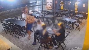 Na madrugada, os suspeitos aproveitaram o pouco movimento na via e roubaram celulares e dinheiro dos clientes e funcionários de uma lanchonete. As vítimas aparecem sentadas, comendo, enquanto homens armados entram, rendem os frequentadores e os colaboradores. Um dos suspeitos está de chapéu. Ele pega os objetos dos clientes. O comparsa vai ao balcão com uma pistola.