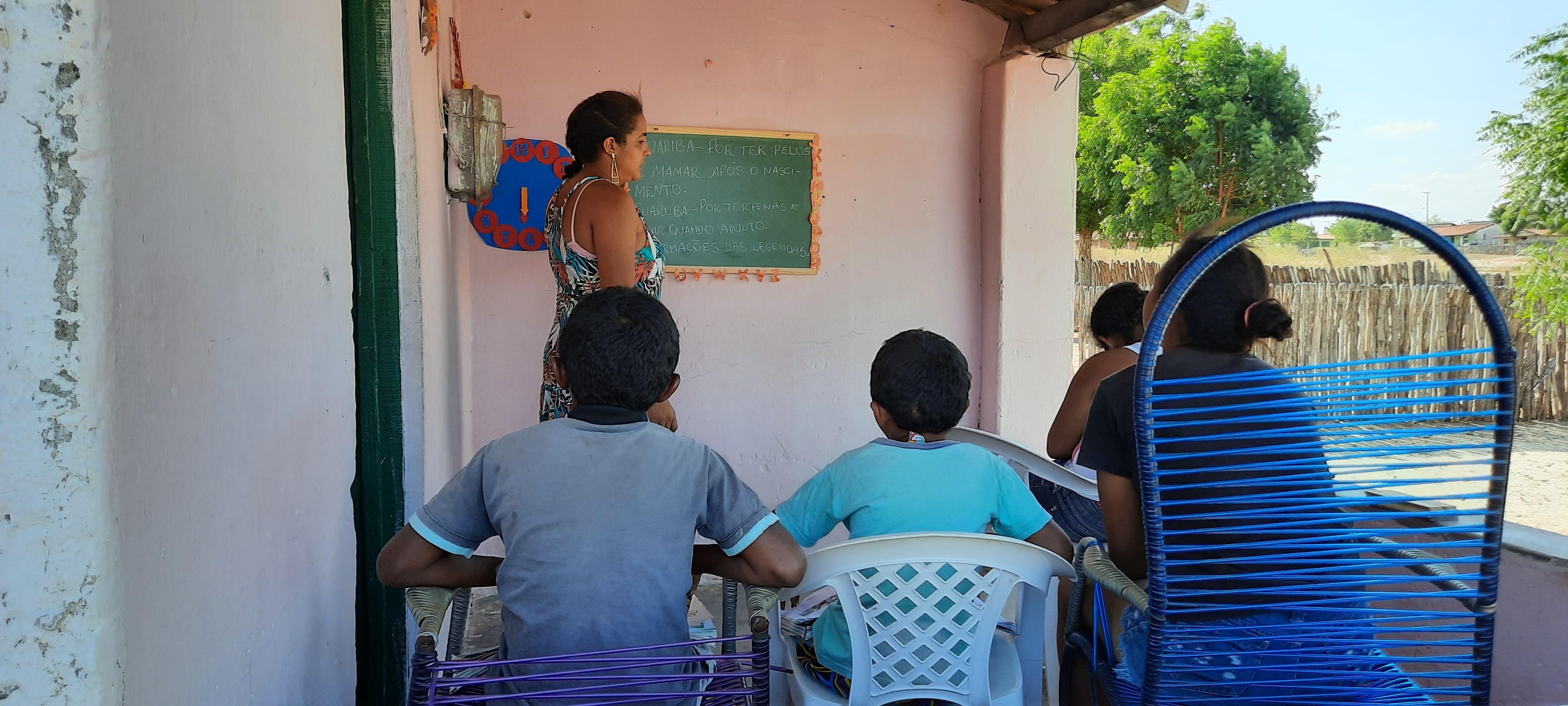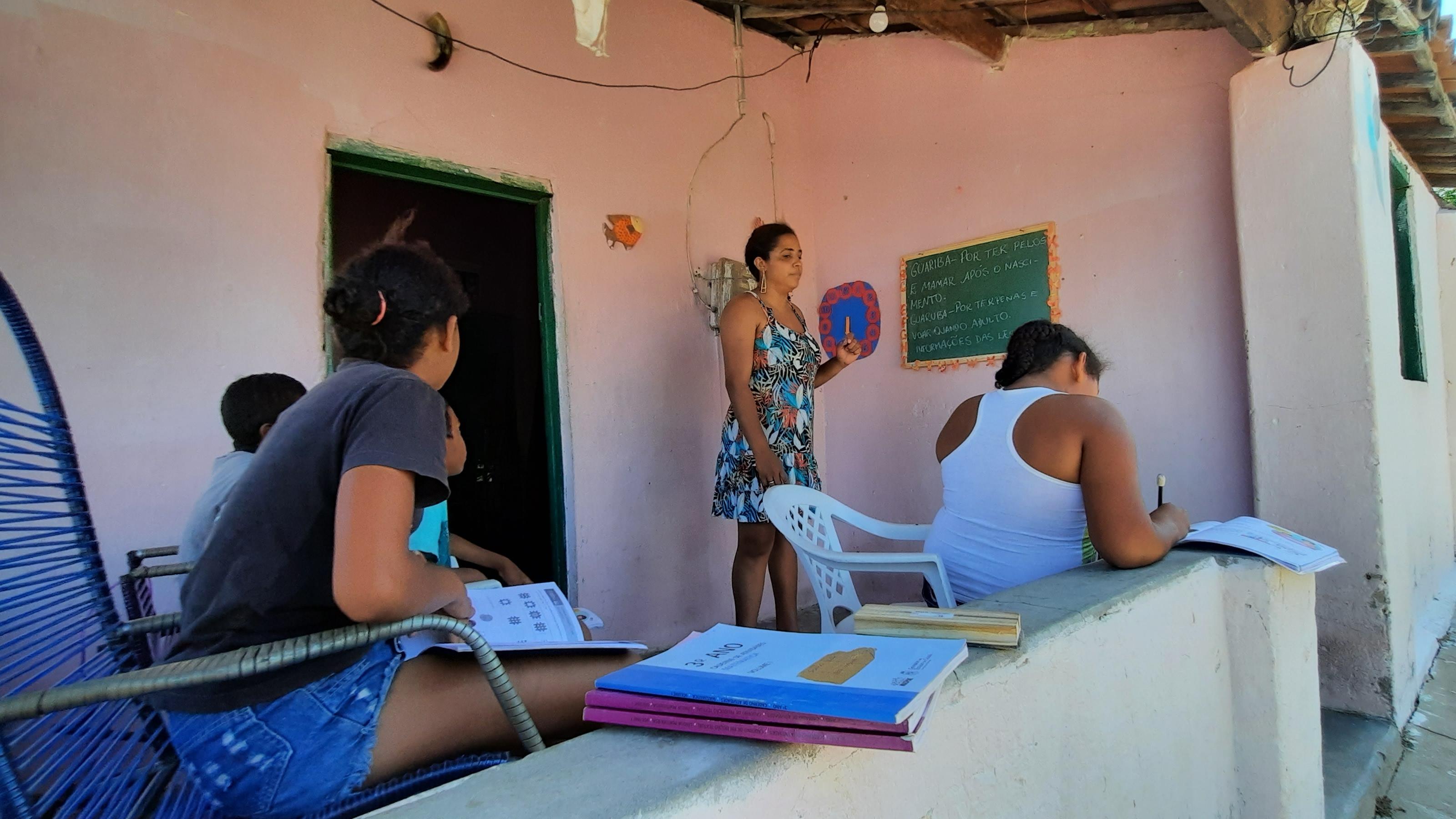 Para driblar as dificuldades do ensino remoto, uma jovem universitária resolveu dar aulas para a filha, de oito anos, e outras crianças do Assentamento Boágua. O acesso à internet no local é limitado