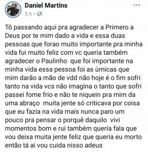 Antes de cometer o suicídio, o jovem deixou um recado se despedindo em seu perfil no Facebook. Daniel cometeu suicídio por enforcamento e seu corpo foi encontrado por familiares. A Polícia Militar e Perícia Forense se encontram no local do ocorrido dando inicio aos devidos procedimentos.