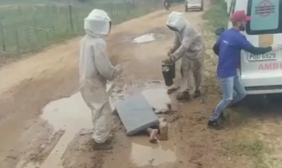 Um vídeo feito por um motorista que passou pelo local, na hora do socorro às vítimas, mostra um homem caído ao chão, enquanto dois técnicos ajudam a remover as abelhas dele, para conseguir colocá-lo na ambulância. Nas imagens, também aparece o motorista de uma dos veículos hospitalares, que tenta espantar os insetos do próprio corpo.