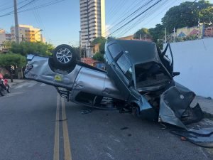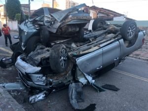 Um acidente envolvendo três veículos acabou com uma Hilux capotada e um carro Voyage sobre ela, na tarde desta sexta-feira (12), na rua Conselheiro Tristão, no Bairro de Fátima. Ninguém ficou ferido.