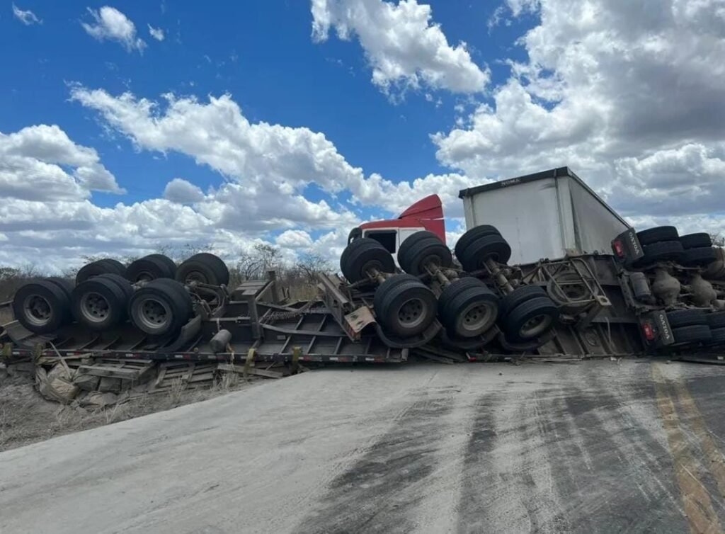 O caminhoneiro não conseguiu desviar a tempo da carreta que tombou na via e invadiu a contramão. Uma criança estava na carreta, mas não ficou ferida.