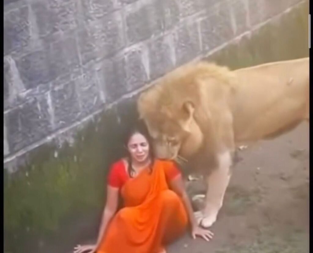 Uma visita a um zoológico na Índia terminou em momentos de tensão após uma mulher cair acidentalmente na jaula dos leões. O incidente ocorreu quando a visitante se apoiou na grade de proteção, perdeu o equilíbrio e caiu dentro do recinto, ficando frente a frente com o animal em questão de segundos.