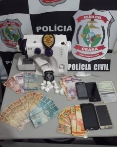 Na casa da flagranteada, dentro de uma máquina de costura os policiais encontraram cerca de 57 gramas de Cocaína e também foram encontrados R$ 1520,00 em cédulas trocadas, além de 4 aparelhos celulares, comprovantes bancários e embalagens para a droga. Em face do viciado, foi lavrado um Termo Circunstanciado de ocorrência com base no artigo 28 da Lei de Drogas. Na casa também haviam alguns adolescentes. Cabe esclarecer que Maria Júlia é companheira de Bruno Maurício, conhecido traficante de drogas de Tauá com várias passagens e foi preso por roubo a menos de um mês e há poucos dias a Ana Brenda, nora de Maria Júlia também havia sido presa por Tráfico de Drogas na mesma casa onde houve a prisão no dia anterior.