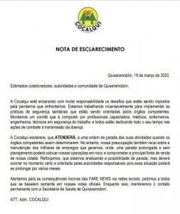 A direção da COCALQUI divulgou nota afirmando que a empresa está seguindo as práticas de segurança sanitárias orientadas pelos órgãos competentes e que foi montado um comitê composto por profissionais capacitados, o qual está realizando ações de combate à transmissão da doença.
