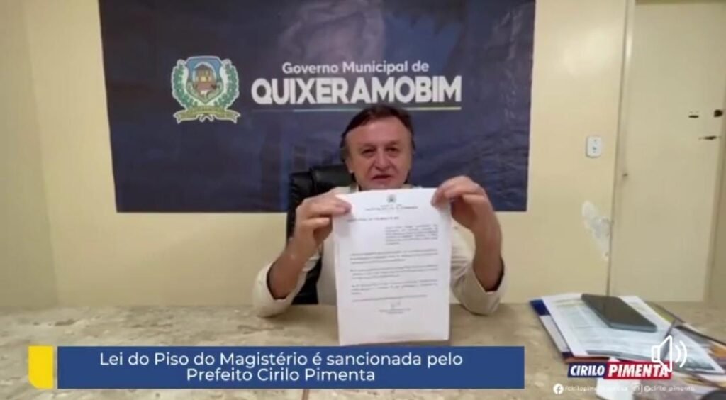 O prefeito Cirilo Pimenta sancionou na manhã da última quarta-feira 23, a lei do piso dos salários dos professores do município de Quixeramobim, um aumento de 33,24% retroativo a janeiro que será pago no mês de março, O Prefeito diz esta feliz e tem a certeza que os professores que sempre se doaram, se deram na sua missão, ficarão também muito felizes”.