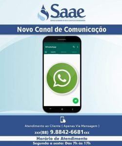 O Serviço Autônomo de Água e Esgoto – SAAE de Quixeramobim está disponibilizando um novo canal de comunicação aos clientes, através do aplicativo WhatSApp, que irá receber apenas mensagem.