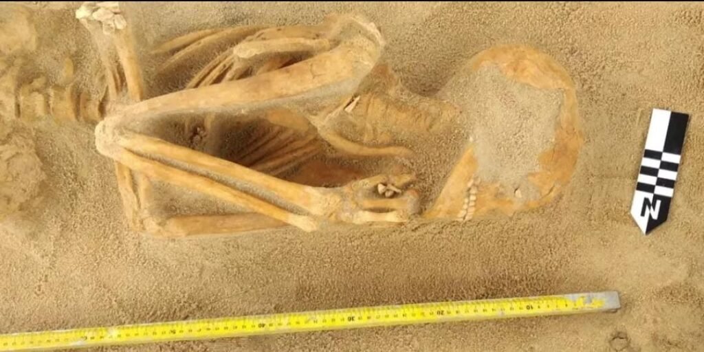Somente quando o esqueleto do bebê for retirado, o que está previsto para ocorrer até a terça-feira (19), a análise passa a focar na ossada do adulto encontrado junto com ele. Enquanto isso, ao lado dele, outro adulto foi enterrado em uma direção totalmente diferente da do enterro do bebê.