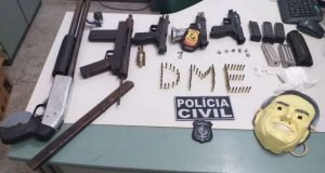 Continuando as diligências, os policiais civis encontraram uma submetralhadora 9 milímetros artesanal conhecida popularmente como “macaquinha” com um carregador desmuniciado, cerca de 115 gramas de cocaína, maconha, além de mais de 100 munições de diversos calibres e uma máscara.