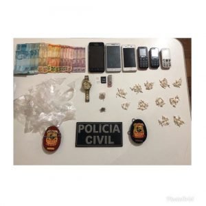 Foi apreendido no interior da residência do suspeito, no bairro Conjunto Esperança, uma grande quantidade de substância entorpecente 107 papelotes de crack e 1 papelote de maconha já prontos para a venda, uma quantidade de dinheiro em espécie (R$515,00), apetrechos utilizados para o tráfico (papelotes etc) e 06 aparelhos celulares.