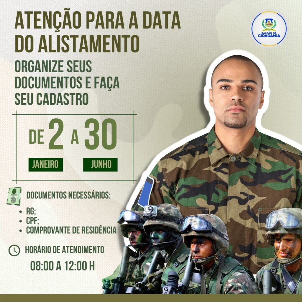 Os jovens que completam 18 anos em 2022 (nascidos em 2004) devem realizar o alistamento militar até o dia 30 de junho. Nosso atendimento é de segunda a sexta a partir das 8:00 horas da manhã ás 12:00 horas.