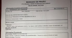 Dando continuidade às ações de combate a criminalidade no município de Quixeramobim/CE, a Polícia Civil cumpriu, na tarde de hoje 28/07/2020, mais um mandado de prisão preventiva em desfavor de Wanderson Costa Medeiro, Vulgo “VÔ” de 18 anos, o qual é suspeito de ter participação no bárbaro crime ocorrido no último dia 18/07/2020, que teve como vítimas as pessoas de José Maria Cosmo Ferreira e Marcos Vinicius da Silva Sousa.