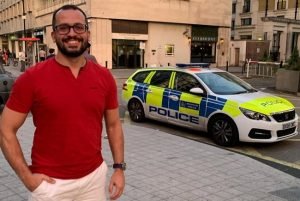Secretário da Segurança Pública, André Costa, em férias na Europa (foto em Londres), parece preferir se manter distante das negociações e estudos sobre o reajuste dos agentes.