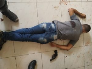 Um dos ladrões caiu morto com um revólver calibre 38 durante o tiroteio na porta da casa de jogo.