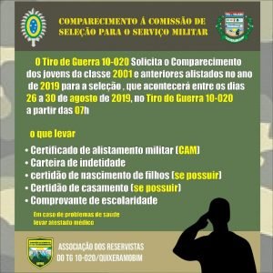 O Comandante do TG 10-020, 1° Sgt SOARES, lembra aos jovens de Quixeramobim, para que os mesmos compareçam ao Tiro de Guerra, no período de 26 a 30 de Agosto, às 07:00 hrs, a fim de participarem da Comissão de Seleção para o Serviço Militar. Enfatiza sobre a importância do evento, pois o jovem alistado terá a oportunidade de servir ao Exército Brasileiro em 2020 e para os que não têm essa pretensão, estes poderão adquirir outros certificados que os que também os deixarão em dia para com o Serviço Militar. O importante é não deixar de comparecer, insiste o Sargento. O jovem alistado pode comparecer ao TG, à Junta do Serviço Militar (Ana Lúcia), ou até mesmo acessar o site do alistamento para conferir a data e hora de sua apresentação.