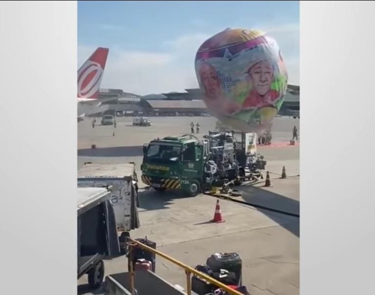 Veja o vídeo: Balão com a marca do SBT cai em cima de avião no Aeroporto de Guarulhos, em São Paulo