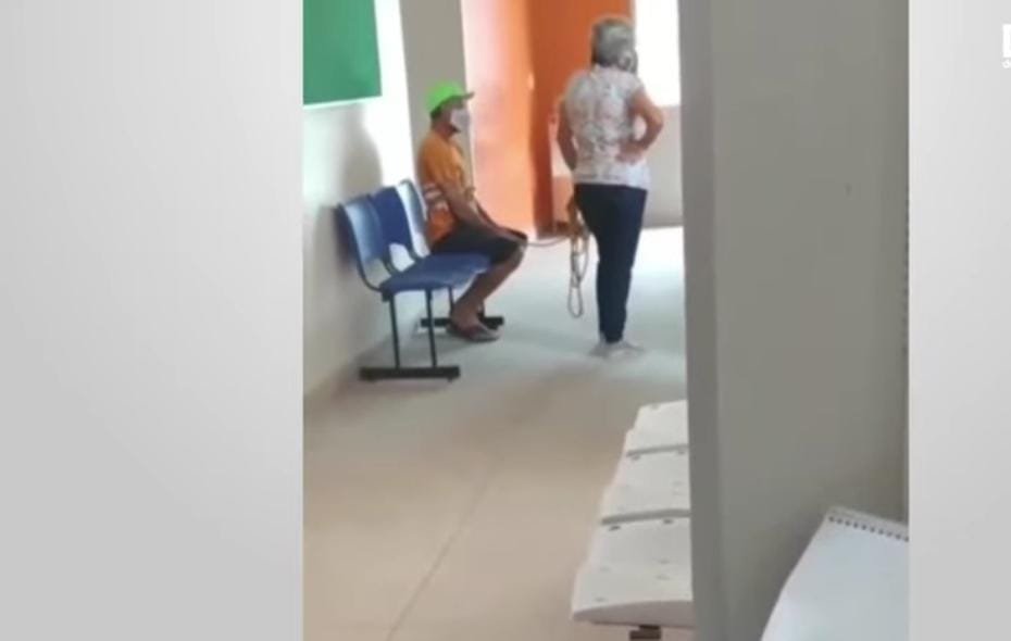 Homem é preso com corda enquanto a sua esposa aguardava atendimento, a cena viralizou nas redes sociais.