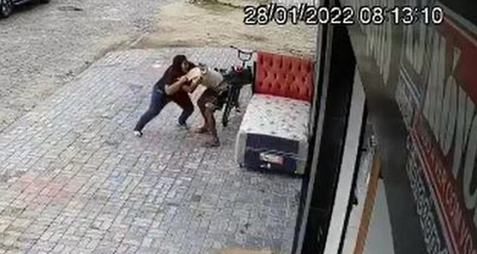 Imagens das câmeras de segurança obtidas pelo portal De Olho em Horizonte, disponibilizadas ao g1, flagraram o momento que o suspeito aborda a vítima, que estava na frente da loja. A mulher tenta segurar os braços do homem, que faz menção de puxar um objeto da cintura.